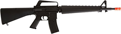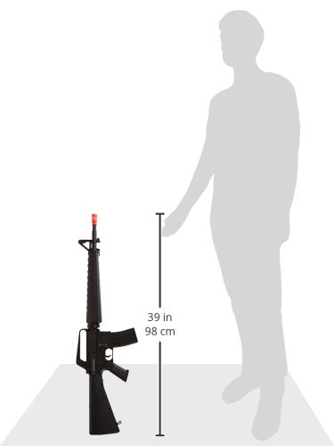 Details: This is an Airsoft BBTac brand Spring M16 Rifle. The scale is 1/1 and the overall length is 98 cm and is based off of the Vietnam style M16A1 with triangular hand guards. Includes Airsoft spring rifle, 50 BBs, safety glasses, and strap. Recommended for ages 18 and up. This is a Spring Airsoft Rifle, which means it's powered by a spring and must be cocked for each shot. It's fast, clean, inexpensive and easily maintained; it requires no gas or batteries to operate. Also, Spring Airsoft Guns are the toughest, most durable of all Airsoft Guns, because they're made with few breakable pieces. If you're looking for a fun, reliable Airsoft Rifle that'll look great and perform even better, you've come to the right place. Package includes extra bag of 1,000 0.12g BBs. Comes in either blue, orange, white or yellow. Color chosen at random.