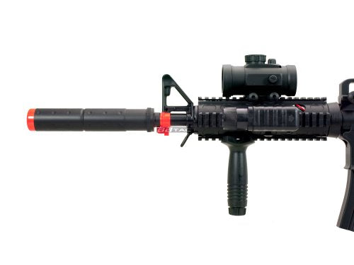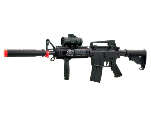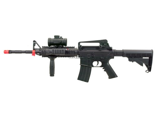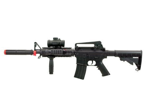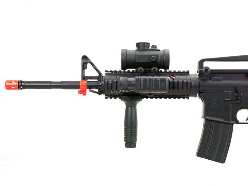 Details: BBTac M83 Light Powered Airsoft Electric Gun. Rifle style with Rail System and comes loaded with multiple accessories such as flashlight, and red dot scope. This package also comes with 6 additional magazines to get you started. Great entry level gun for kids starting off in airsofting. Good for backyard wars. Rifle can be setup for full size or CQB with moevable stock. Rails for the multiple accessories attachments. Great gun at a low price. Quick Trouble Shooting Notes:1. If the airsoft rifle is NOT able to shoot please try shooting it upside down with the magazine inside. If this fires then it means the magazine is in need of a replacement. 2. If the charger is NOT getting warm through a charge then this means the charger is in need of a replacement. 3. If the battery is NOT getting warm through a charge then this means that the battery is in need of a replacement.