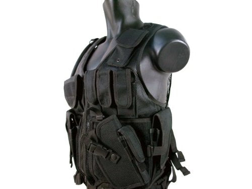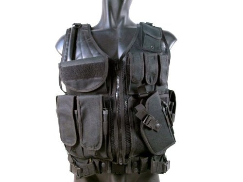 Details: This is a tactical airsoft Cross Draw Vest by MetalTac. It comes with 9 pockets, a pistol holster, and is also great body armor protection. There is also a pocket in the upper left shoulder area that can be used to hold a radio or walkie talkie. The larger pockets located at the bottom are used to hold magazines and there is also a belt strap included. A zipper is used to open and close up the vest for easy access to put on or remove. This is one of the best vest out there you can get with all of these features.